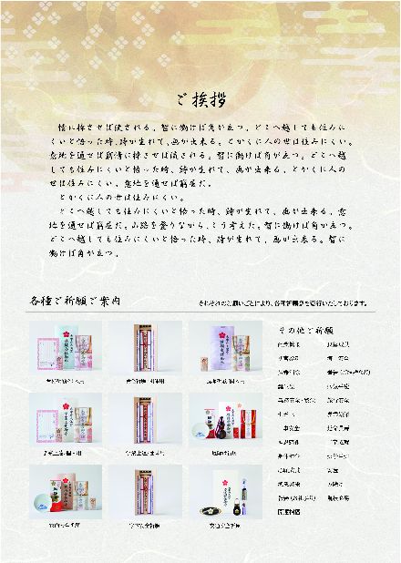 表紙を開くと宮司様のごあいさつ、貴神社のご奉仕品紹介/お守り、絵馬、縁起物、各種記念品等の授与品の紹介が入ります。